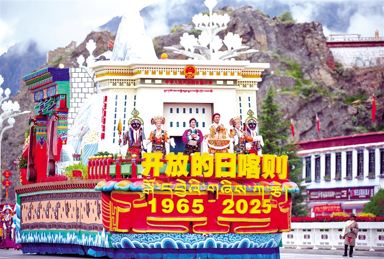 “開(kāi)放的日喀則”彩車。本網(wǎng)記者 潘多 攝