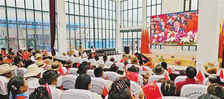 海拔5373米的浪卡子縣普瑪江塘鄉(xiāng)干部群眾通過多種形式收聽收看大會盛況,共同見證這一重要的歷史時刻。普瑪江塘鄉(xiāng)黨委書記多吉旺久說:“60年來,普瑪江塘鄉(xiāng)從過去靠天吃飯到如今靠科技吃飯,巨大的變化離不開黨中央的親切關懷和黨的民族政策,我們一定銘記黨的恩情,永遠聽黨話、感黨恩、跟黨走。”